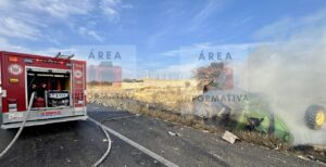Un trailer habia chocado con una trilladora y esta se incendió por el impacto.