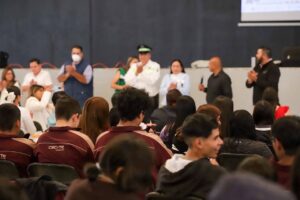 quien dialogó con estudiantes del CECyTE, así como de la Escuela de Enfermería “Beatriz