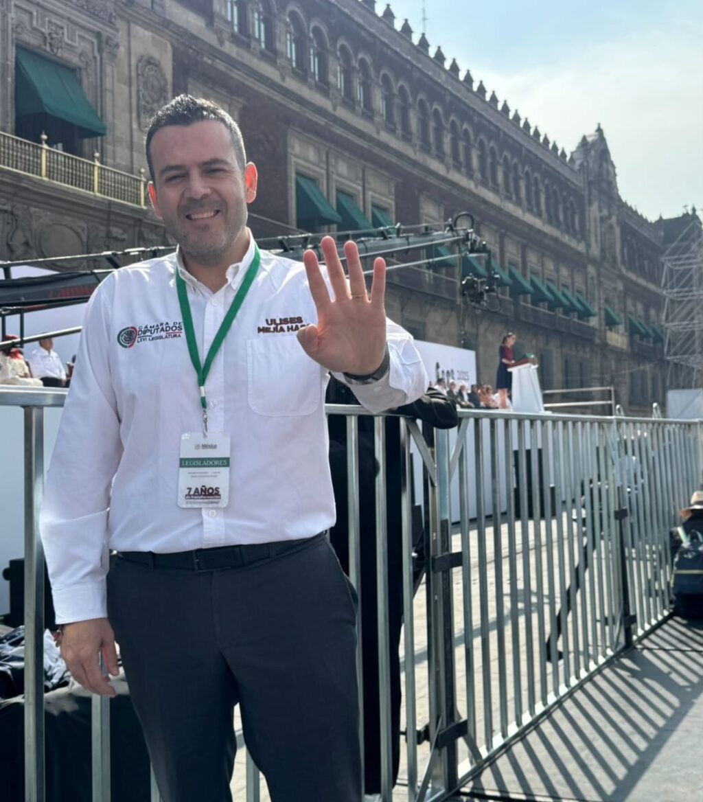 En el marco del séptimo aniversario del gobierno de la Cuarta Transformación, el diputado federal Ulises Mejía Haro acompañó este día a la presidenta Claudia Sheinbaum Pardo en el Zócalo de la Ciudad de México, donde miles de personas se reunieron para conmemorar los avances alcanzados desde 2018. El encuentro reafirmó la unidad nacional y el compromiso de seguir construyendo un gobierno cercano, honesto y orientado al bienestar del pueblo.