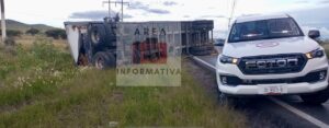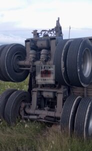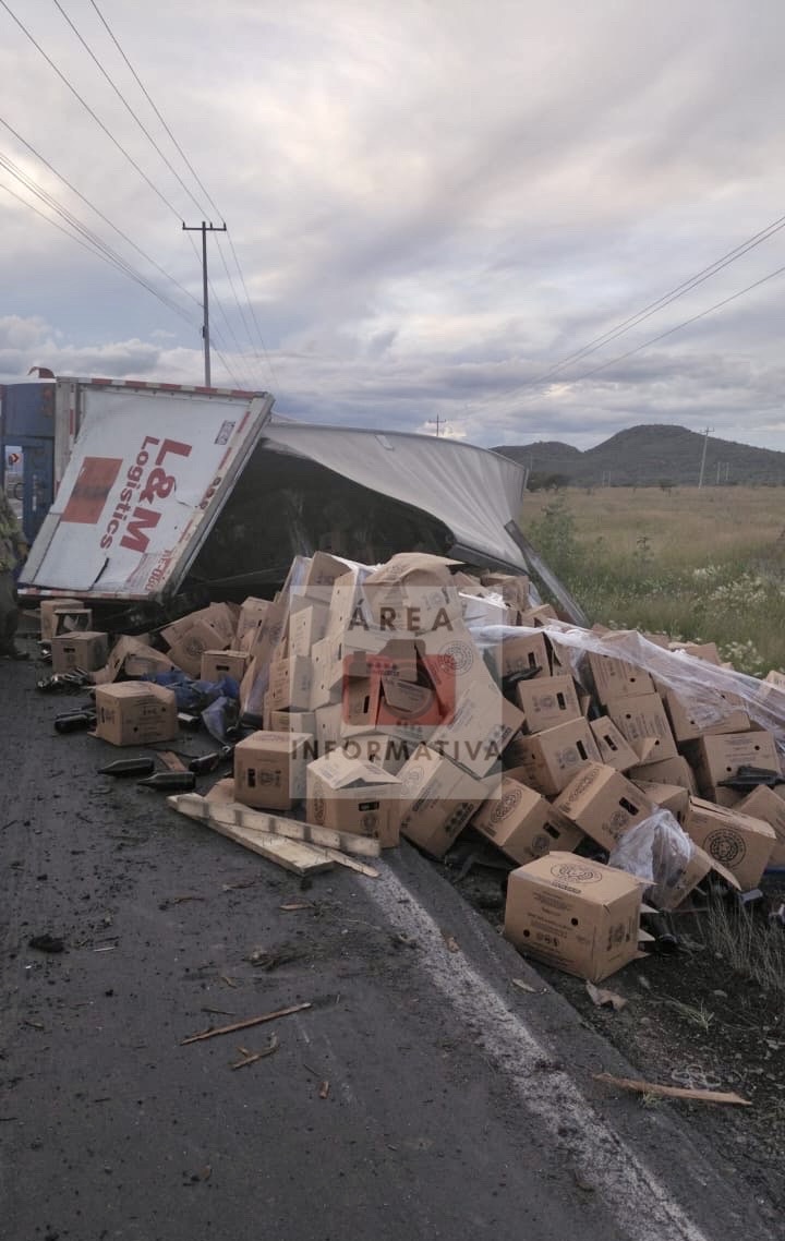 En ese sitio estaba volcado un remolque que estiraba un tráiler; en el remolque transportaban cajas con envases de cerveza vacíos.